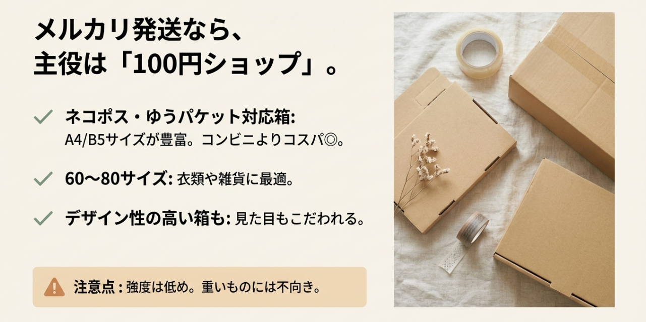 実は、用途に合わない箱を使うと送料が高くなるだけでなく、強度が足りずに配送中の破損トラブルにもつながりかねません。結論として、メルカリなどの小物は100均やコンビニ、引越し用やまとめ買いなら通販やホームセンターを選ぶのがおすすめです。